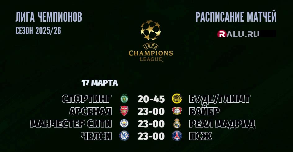 17 марта 2026 года состоятся четыре матча в рамках Лиги Чемпионов
