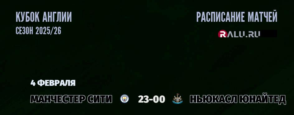 В 23-00 ФК «Манчестер Сити» проведет домашний матч с ФК «Ньюкасл Юнайтед». В прошлой встрече между командой Ньюкасл Юнайтед и командой Манчестер Сити, которая состоялась 13 января 2026 года - победу со счетом 2:0 одержала команда Манчестер Сити. На 4 февраля в турнирной таблице Кубка Англии Манчестер Сити занимает 1-е место, а Ньюкасл Юнайтед занимает 1-е место .