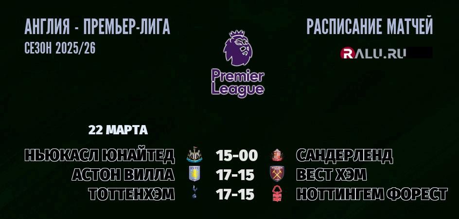 22 марта 2026 года состоятся три матча в рамках Премьер лиги Англии
