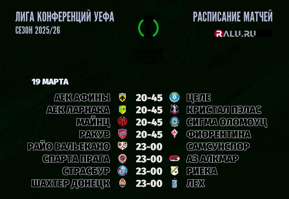 19 марта 2026 года в прямом эфире восемь матчей в рамках Лиги конференций УЕФА