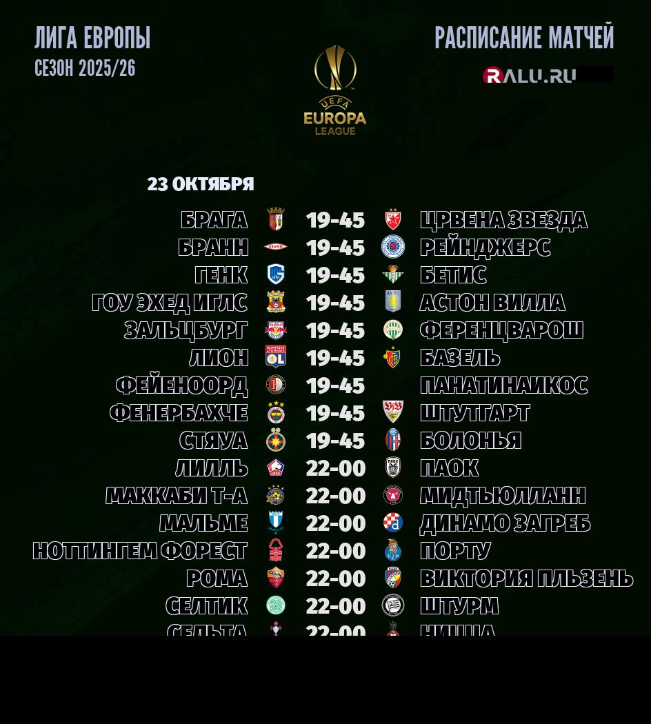 16 октября нет матчей Лига Европы, ближайшие матчи состоятся 23 октября: