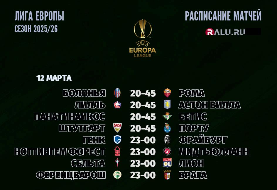 12 марта 2026 года в прямом эфире восемь матчей в рамках Лиги Европы