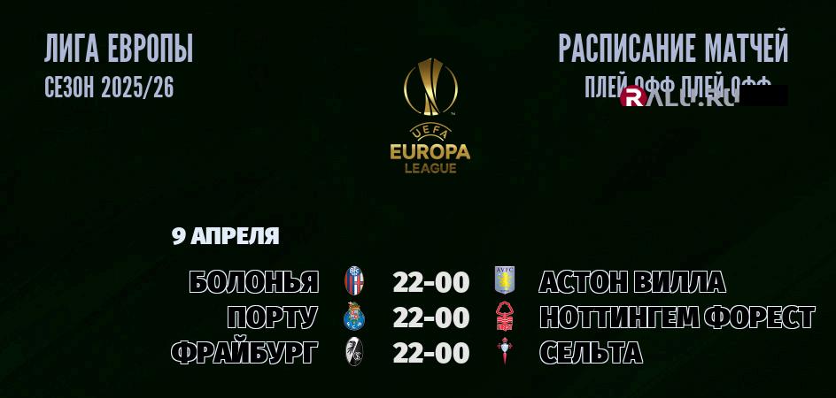 9 апреля 2026 года состоятся три матча в рамках Лиги Европы