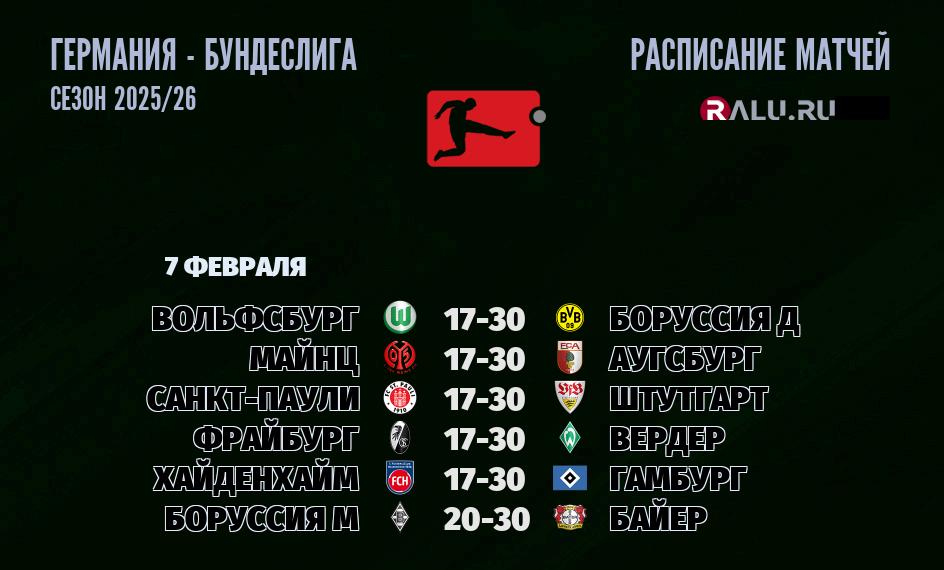 7 февраля 2026 года в прямом эфире шесть встреч в рамках Бундеслиги Германии