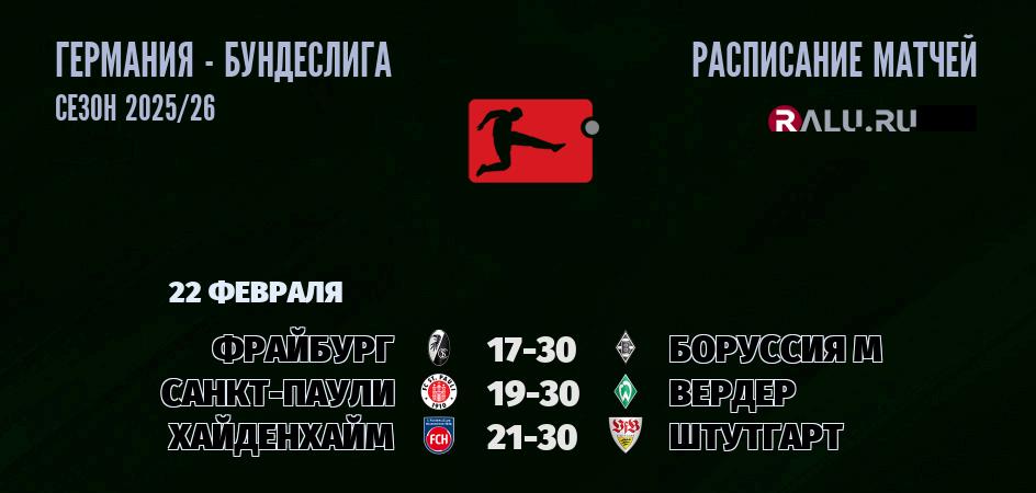 22 февраля 2026 года состоятся три матча в рамках Бундеслиги Германии