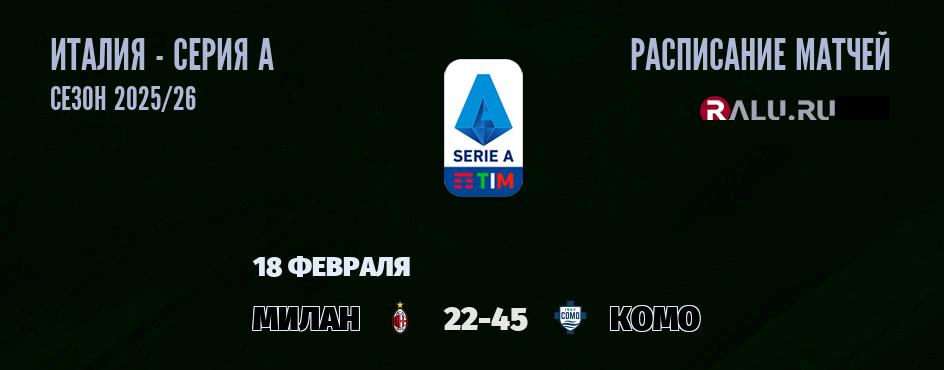 В 22-45 «Милан» встречается с футбольным клубом «Комо». В прошлой встрече между командой Комо и командой Милан, которая состоялась 15 января 2026 года - победу со счетом 3:1 одержала команда Милан. На 17 февраля в турнирной таблице Серии А чемпионата Италии Милан занимает 7-е место, а Комо занимает 34-е место .