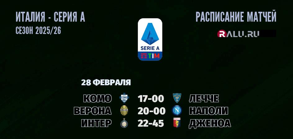 28 февраля 2026 года состоятся три матча в рамках Серии А чемпионата Италии