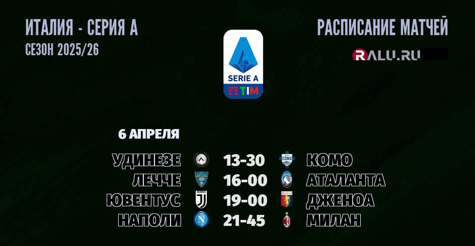 6 апреля 2026 года состоятся четыре матча в рамках Серии А чемпионата Италии