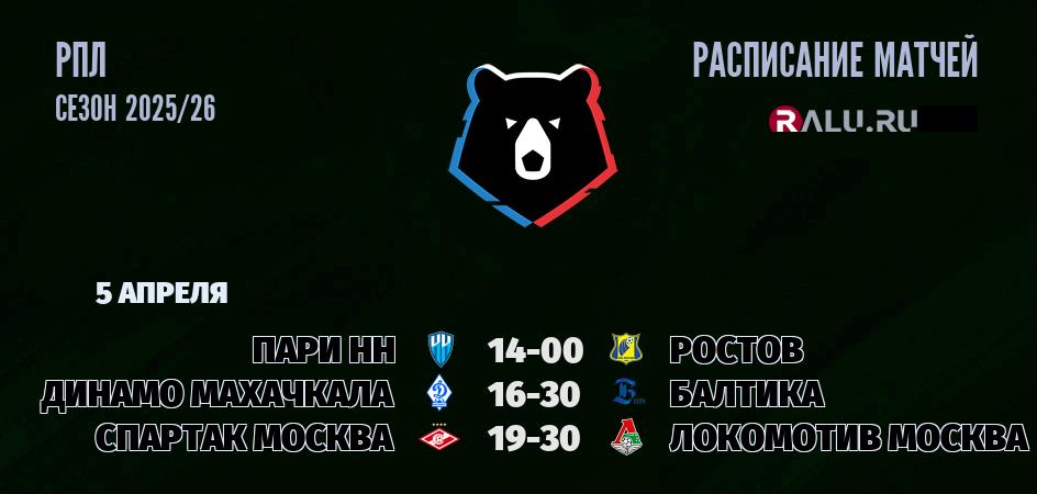 5 апреля 2026 года состоятся три матча в рамках чемпионата РПЛ