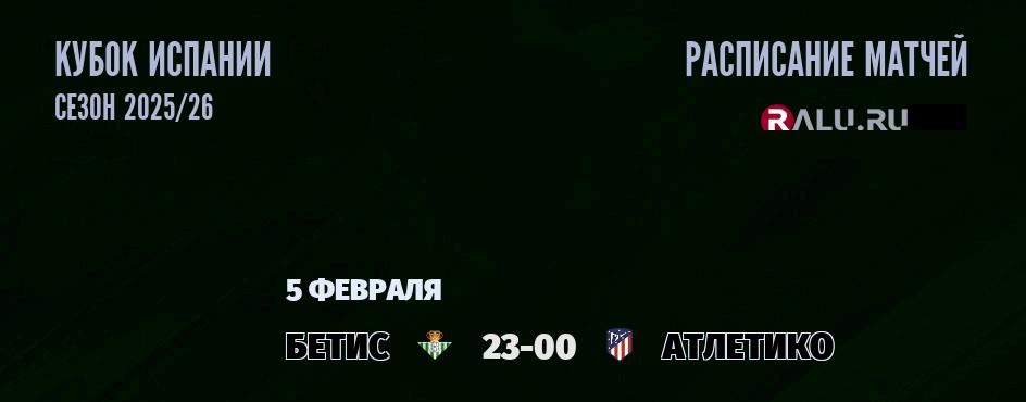В 23-00 «Бетис» в домашнем матче сразится с футбольным клубом «Атлетико». В прошлой встрече между командой Бетис и командой Атлетико, которая состоялась 27 октября 2025 года - победу со счетом 2:0 одержала команда Атлетико. На текущий момент в турнирной таблице Кубка Испании Бетис занимает 1-е место, а Атлетико занимает 1-е место .