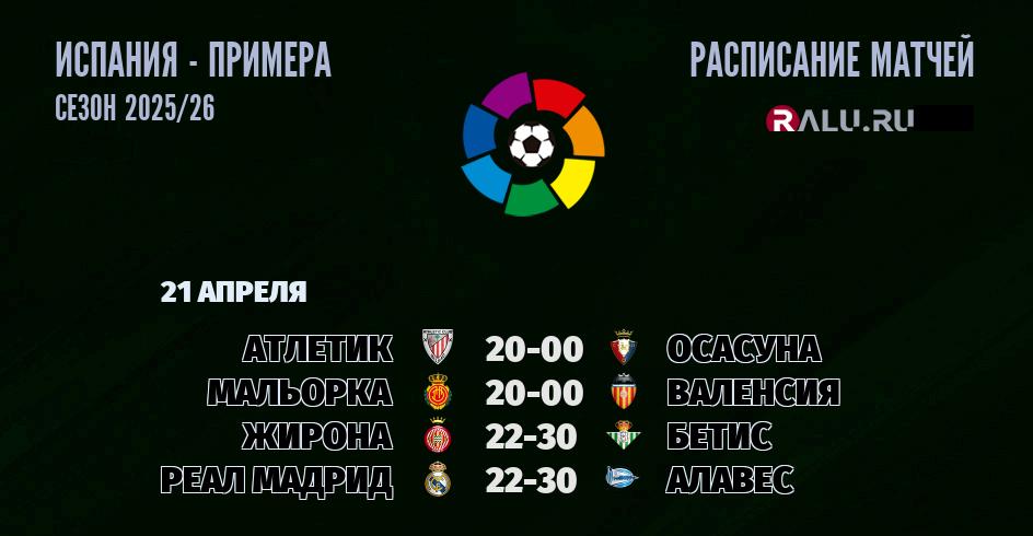 21 апреля 2026 года состоятся четыре матча в рамках чемпионата Испании