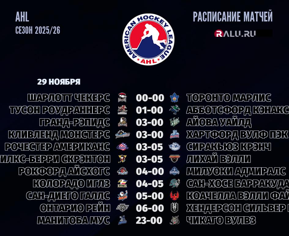 29 ноября 2025 года пройдут одиннадцать встреч в рамках чемпионата AHL
