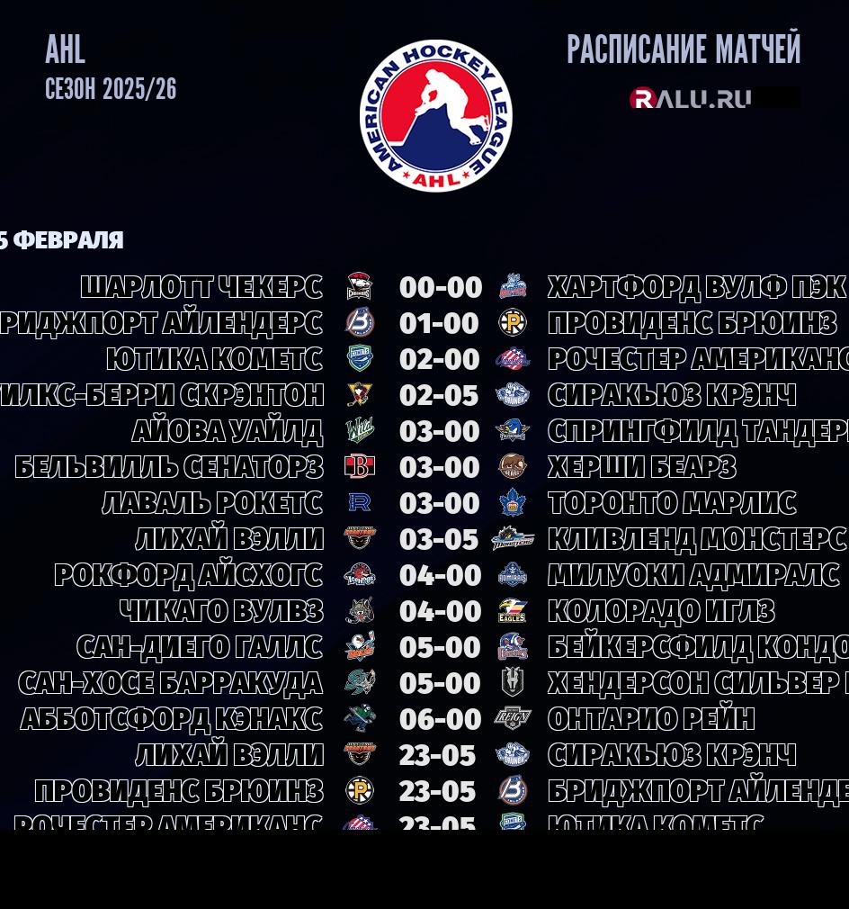 В 23-05 «Лихай Вэлли» играет с командой «Сиракьюз Крэнч». В прошлой встрече между командой Лихай Вэлли и командой Сиракьюз Крэнч, которая состоялась 18 января 2026 года - победу в основное время со счетом 4:1 одержала команда Сиракьюз Крэнч. На 14 февраля в турнирной таблице чемпионата AHL Лихай Вэлли занимает 14-е место, а Сиракьюз Крэнч занимает 4-е место .