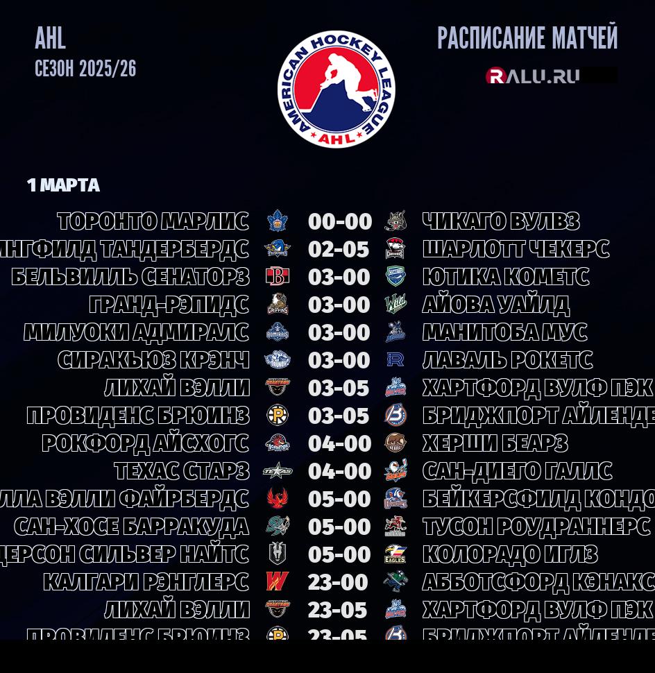 1 марта 2026 года пройдет большой тур - 16 матчей в рамках чемпионата AHL