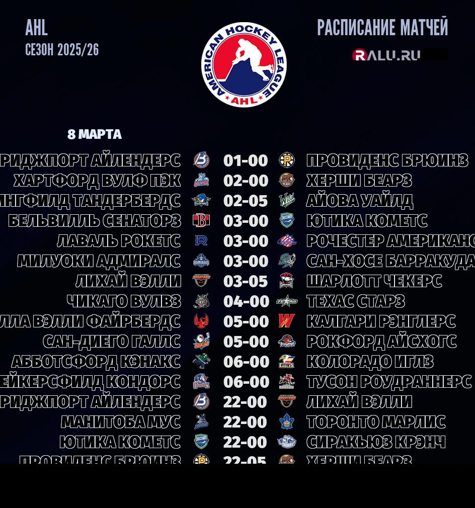 В 03-00 команда «Лаваль Рокетс» в домашнем матче попробует взять верх над ХК «Рочестер Американс». В этой встрече между командой Лаваль Рокетс и командой Рочестер Американс, которая состоялась 7 марта 2026 года - победу в основное время со счетом 4:2 одержала команда Лаваль Рокетс. На данный момент в турнирной таблице чемпионата AHL Лаваль Рокетс занимает 1-е место, а Рочестер Американс занимает 2-е место .
