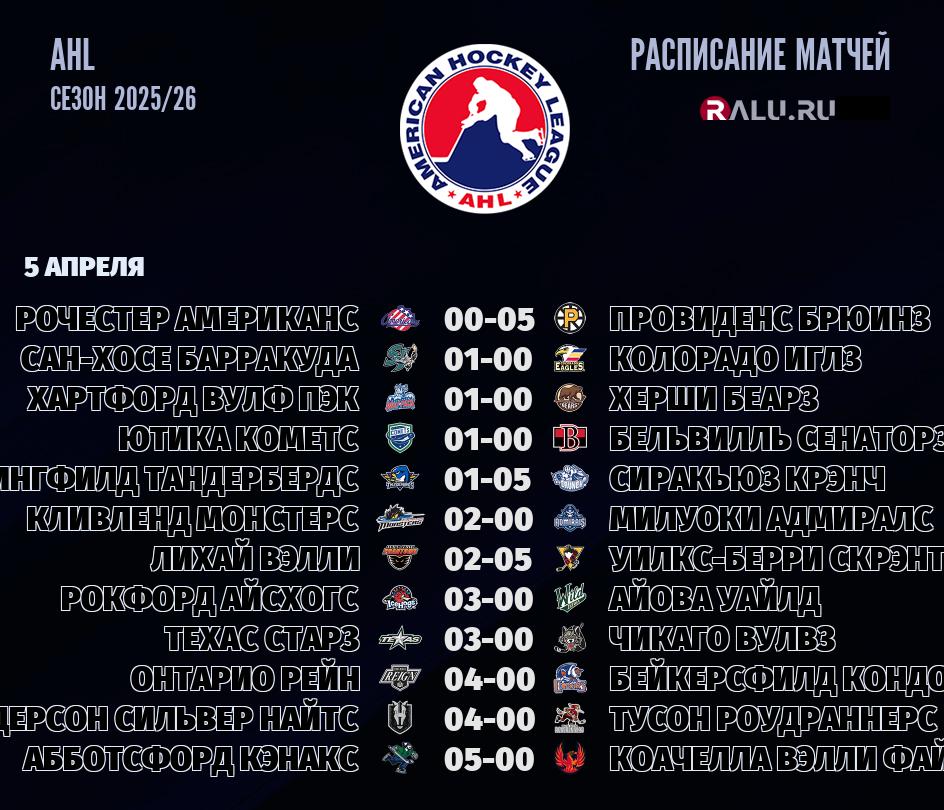 5 апреля 2026 года состоится большой тур - 12 матчей в рамках чемпионата AHL