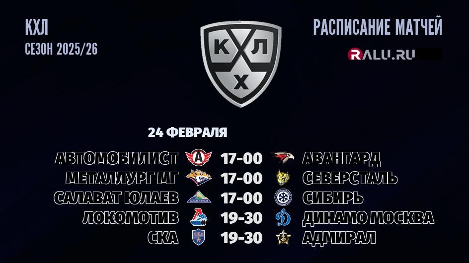 24 февраля 2026 года пройдут пять хоккейных поединков в рамках чемпионата КХЛ