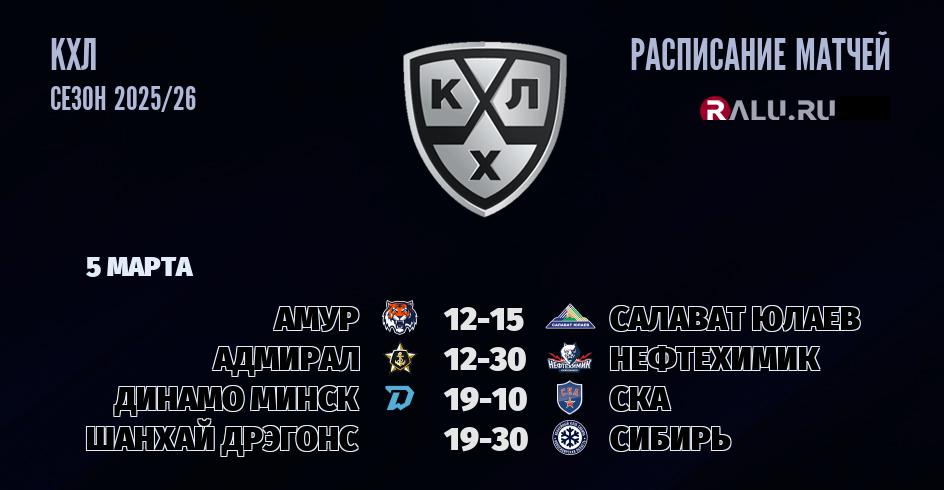 5 марта 2026 года состоятся четыре матча в рамках чемпионата КХЛ