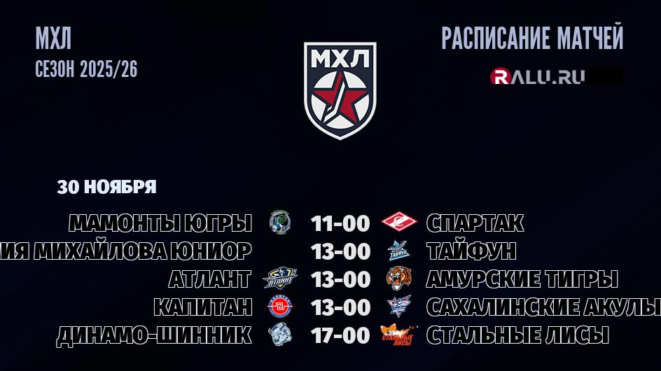 30 ноября 2025 года пройдут пять хоккейных поединков в рамках чемпионата МХЛ