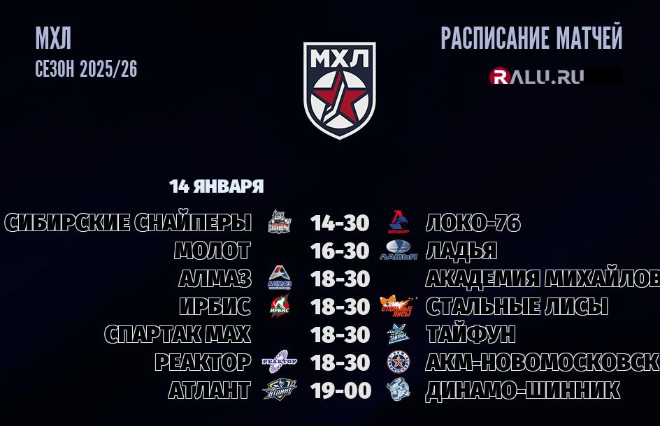 14 января 2026 года пройдут трансляции семи игр в рамках чемпионата МХЛ