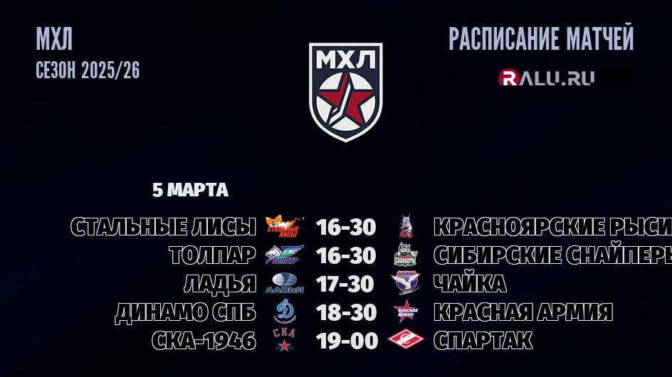 5 марта 2026 года пройдут пять хоккейных поединков в рамках ПЛЕЙ-ОФФ чемпионата МХЛ