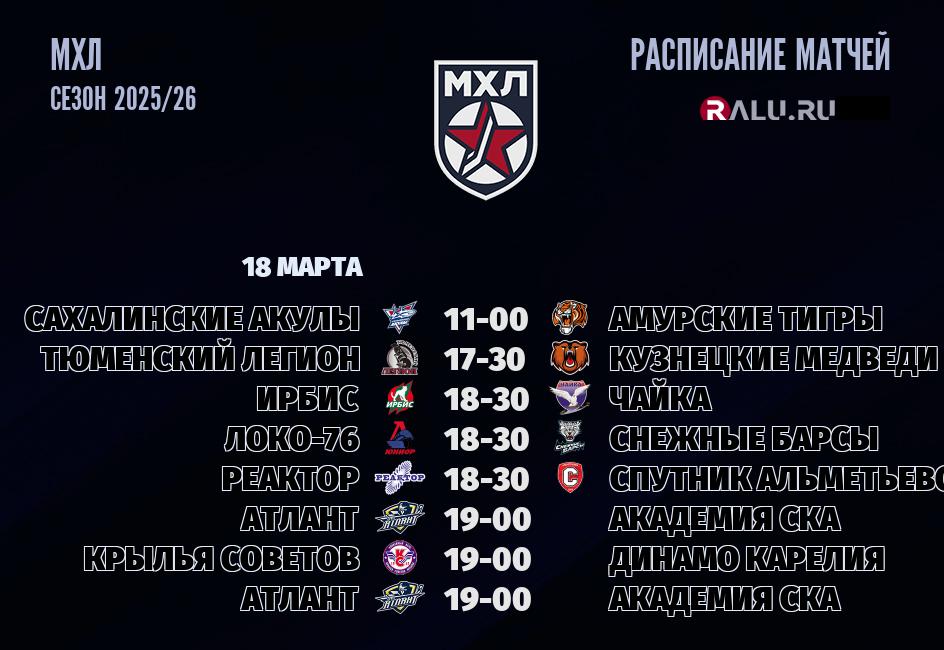 18 марта 2026 года в прямом эфире восемь матчей в рамках ПЛЕЙ-ОФФ чемпионата МХЛ