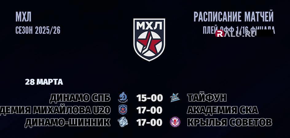 28 марта 2026 года состоятся три матча в рамках ПЛЕЙ-ОФФ чемпионата МХЛ