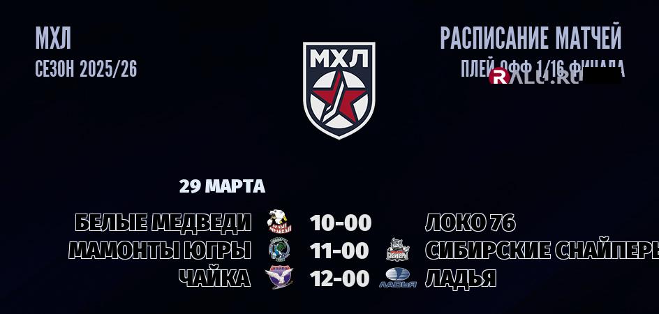 29 марта 2026 года состоятся три матча в рамках ПЛЕЙ-ОФФ чемпионата МХЛ