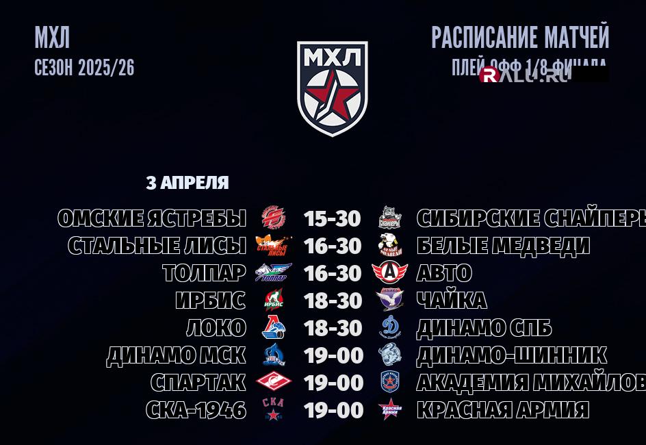 3 апреля 2026 года в прямом эфире восемь матчей в рамках ПЛЕЙ-ОФФ чемпионата МХЛ