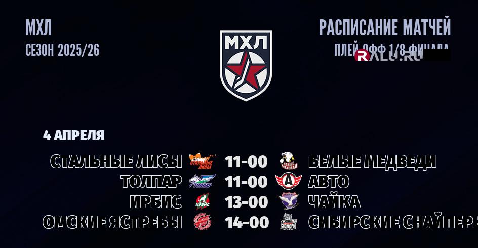 4 апреля 2026 года состоятся четыре матча в рамках ПЛЕЙ-ОФФ чемпионата МХЛ