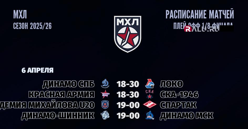 6 апреля 2026 года состоятся четыре матча в рамках ПЛЕЙ-ОФФ чемпионата МХЛ