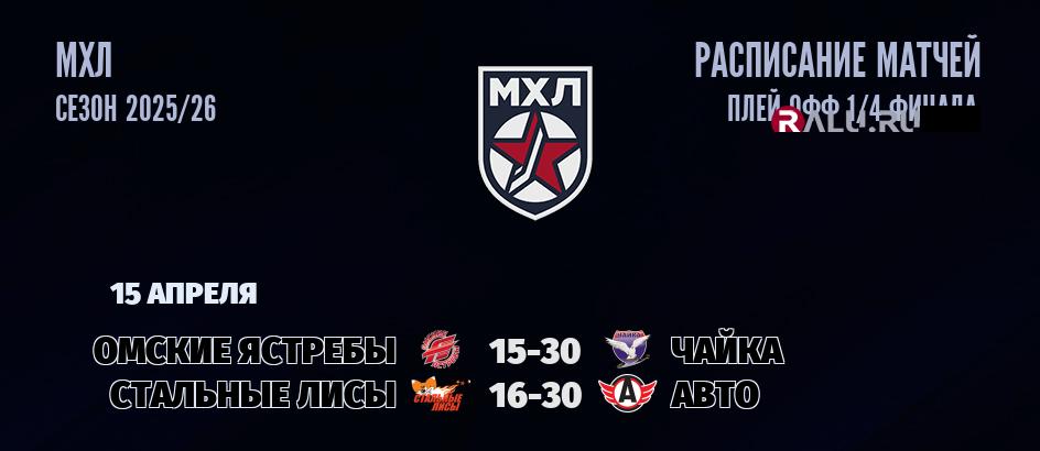 15 апреля 2026 года пройдут две встречи в рамках ПЛЕЙ-ОФФ чемпионата МХЛ
