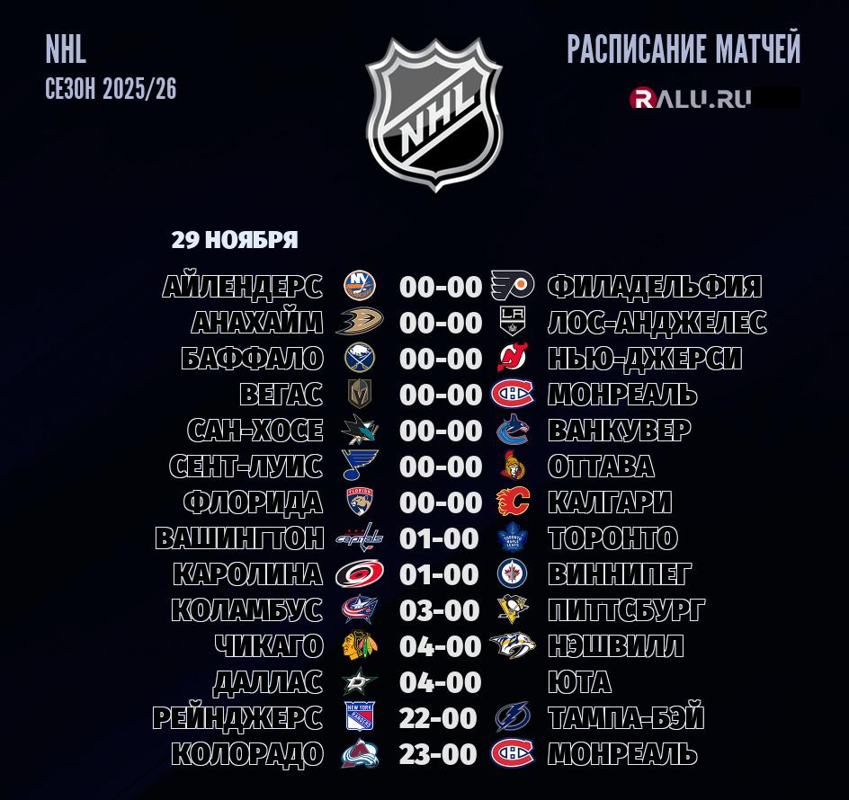 29 ноября 2025 года запланирован тур - 14 матчей в рамках чемпионата NHL