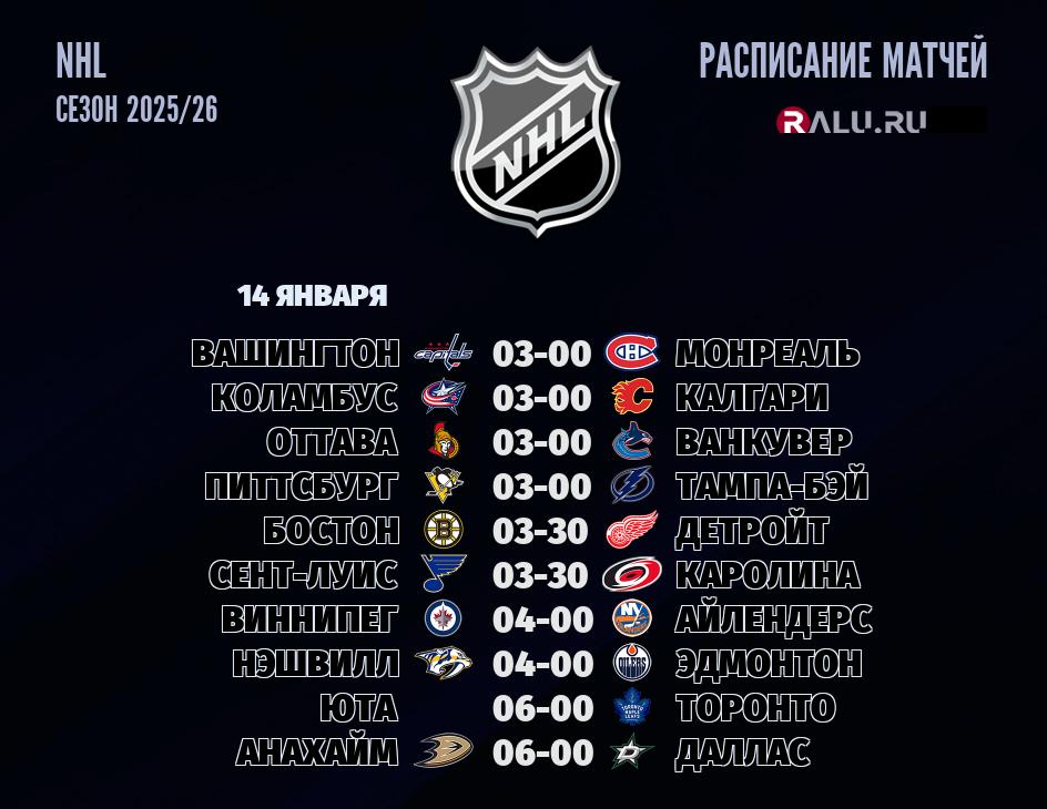 14 января 2026 года в прямом эфире десять матчей в рамках чемпионата NHL