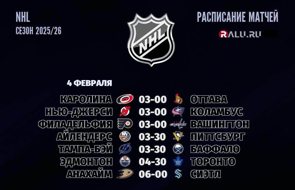 4 февраля 2026 года пройдут трансляции семи игр в рамках чемпионата NHL