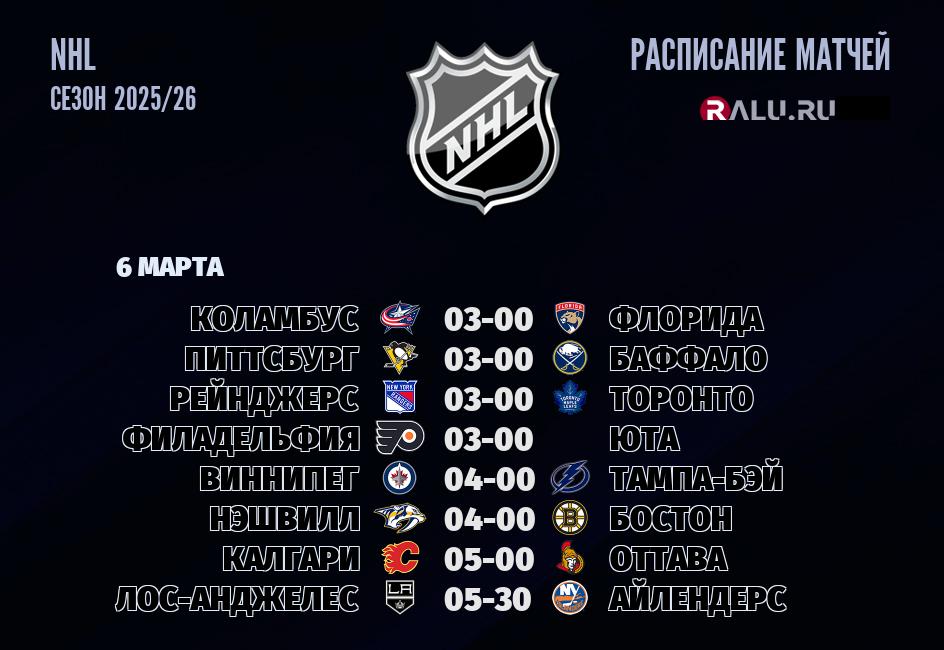 6 марта 2026 года в прямом эфире восемь матчей в рамках чемпионата NHL