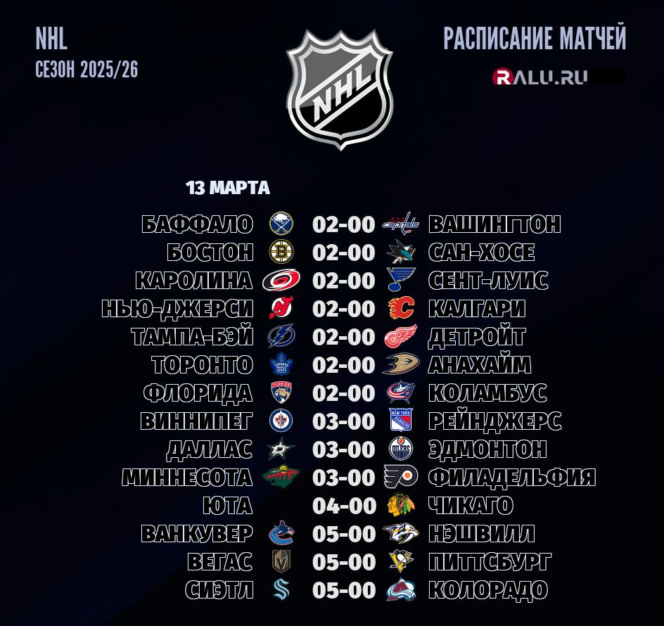 13 марта 2026 года запланирован тур - 14 матчей в рамках чемпионата NHL