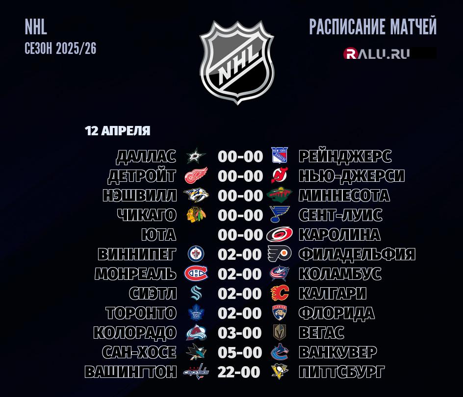 12 апреля 2026 года состоится большой тур - 12 матчей в рамках чемпионата NHL