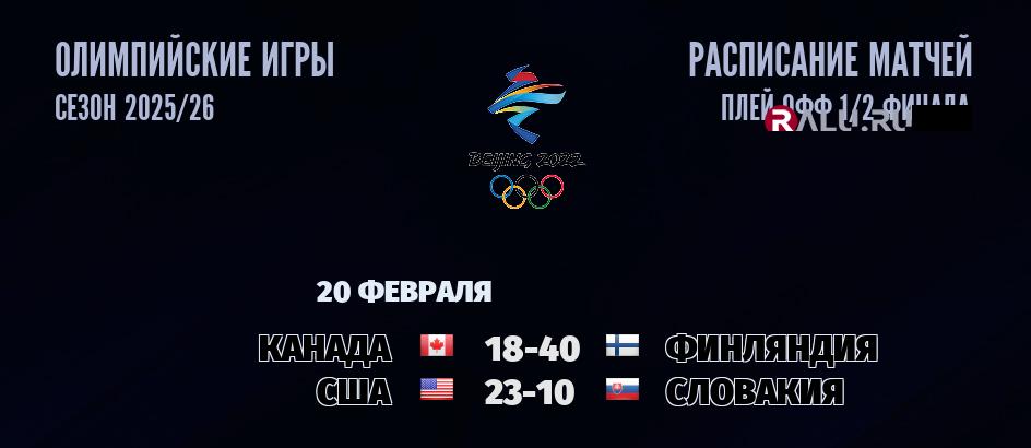 В 18-40 национальная сборная Канады играет со сборной Финляндии. В прошлой встрече между сборной Канады и сборной Финляндии, которая состоялась 20 февраля 2026 года - победу в основное время со счетом 3:2 одержала сборная Канада. В турнирной таблице Олимпийских игр Канада занимает 1-е место, а Финляндия занимает 2-е место .