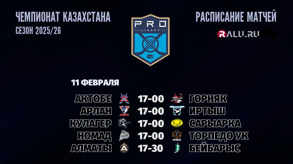 11 февраля 2026 года пройдут пять хоккейных поединков в рамках чемпионата Казахстана