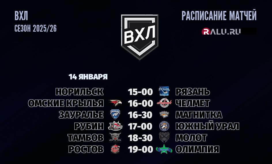 14 января 2026 года в прямом эфире шесть встреч в рамках чемпионата ВХЛ