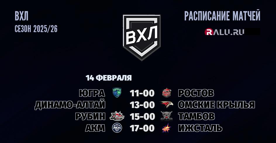 14 февраля 2026 года состоятся четыре матча в рамках чемпионата ВХЛ