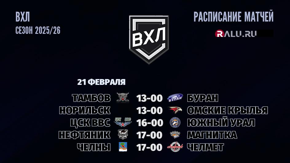 21 февраля 2026 года пройдут пять хоккейных поединков в рамках чемпионата ВХЛ