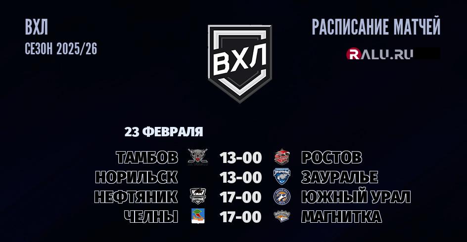 23 февраля 2026 года состоятся четыре матча в рамках чемпионата ВХЛ