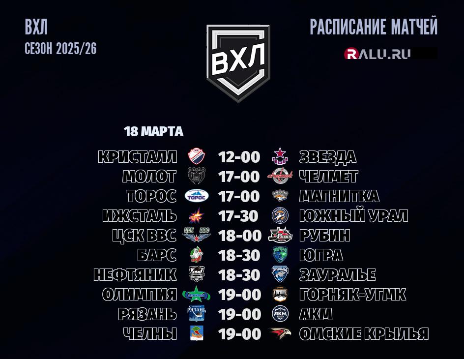 18 марта 2026 года в прямом эфире десять матчей в рамках чемпионата ВХЛ