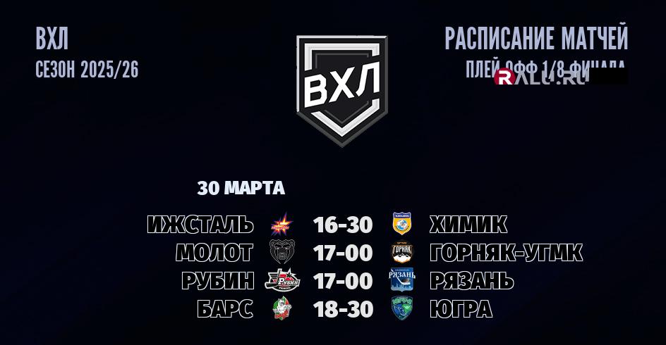 30 марта 2026 года состоятся четыре матча в рамках ПЛЕЙ-ОФФ чемпионата ВХЛ